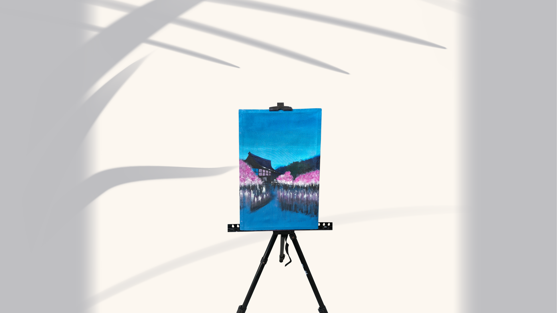• Powerful Imagery: Features the iconic scene of a traditional East Asian pavilion silhouetted against a bright sky, surrounded by vibrant pink cherry blossoms (Sakura) and their mesmerizing reflection in the still water.